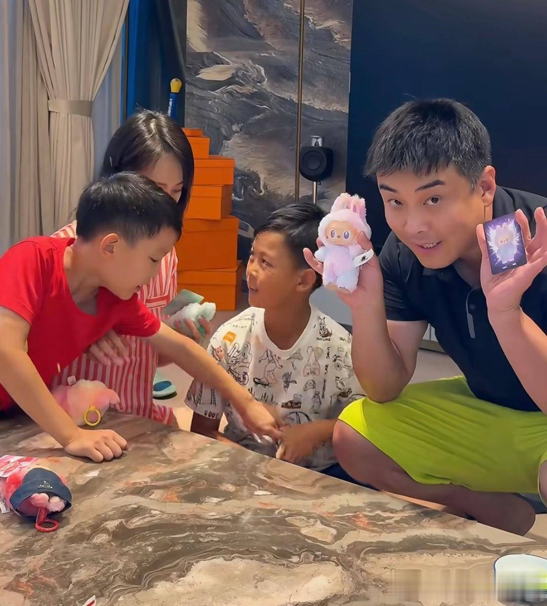 王皓在外面责任带队谨慎严肃,然则每次回到家里王人会切换很轻柔的一面,对俩男儿有问必答,前阵子拉布布刚火起来的技艺,王皓就给孩子们买了一整套盲盒,相配大方。