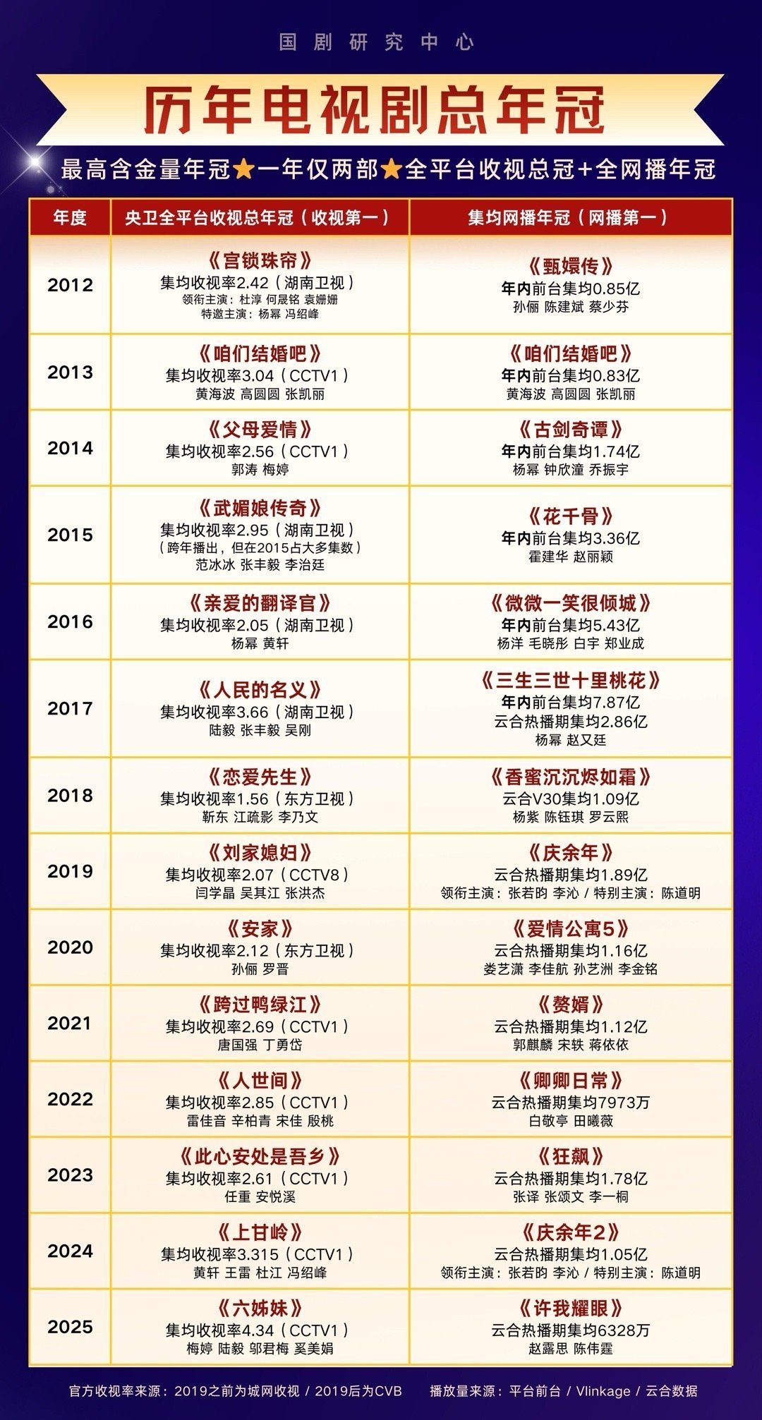 在这份榜单中,官方的统计时分是2012年至2025年,并贴心肠进行离别,分为央卫全平台收视率冠军和集均网播年冠,接下来,我们沿路看一看: