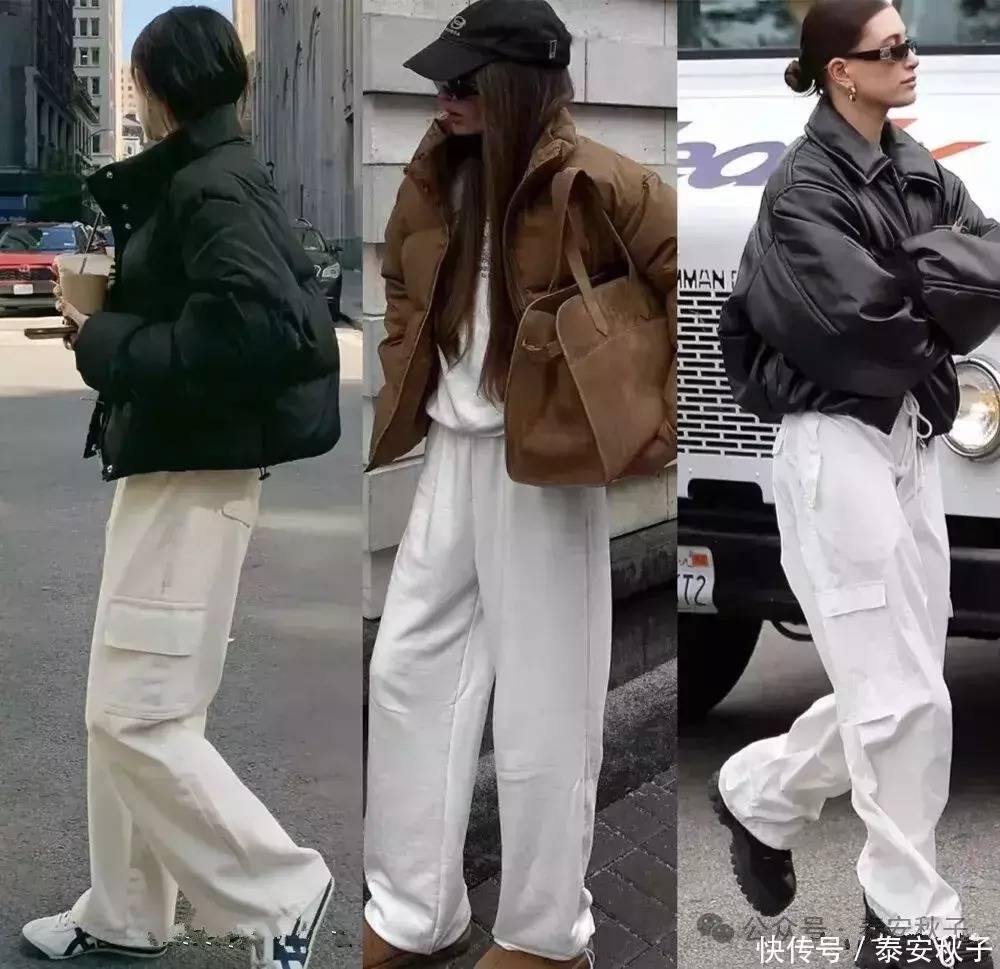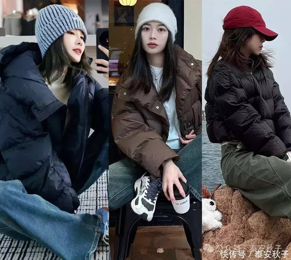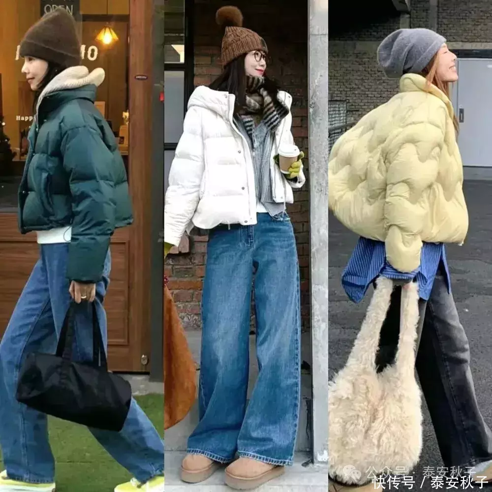 冬天想穿得文明又不肥壮,最通俗实用的便是 “上短下长” 的叠穿法——用短款羽绒服搭高腰阔腿裤就行。