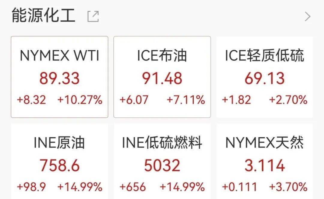 油价不竭高潮势头。WTI原油涨10.27%,报89.33好意思元/桶,续创2024年4月以来新高。布伦特原油涨7.11%,报91.48好意思元/桶,续创2024年4月以来新高。