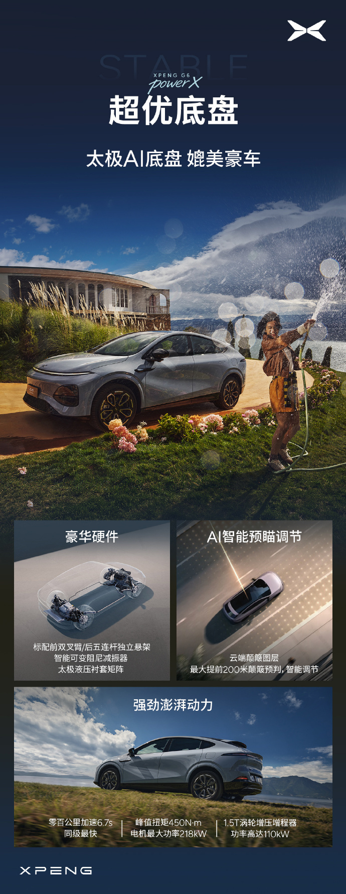 小鹏G6全系标配800V高压架构及5C超充AI电板,最快12分钟补能314公里,百公里空洞电耗13.9kWh。车辆搭载第二代VLA智能驾驶系统,车端有用算力2250TOPS,接济AEB最高刹停速率130km/h及180km/h爆胎稳行功能。