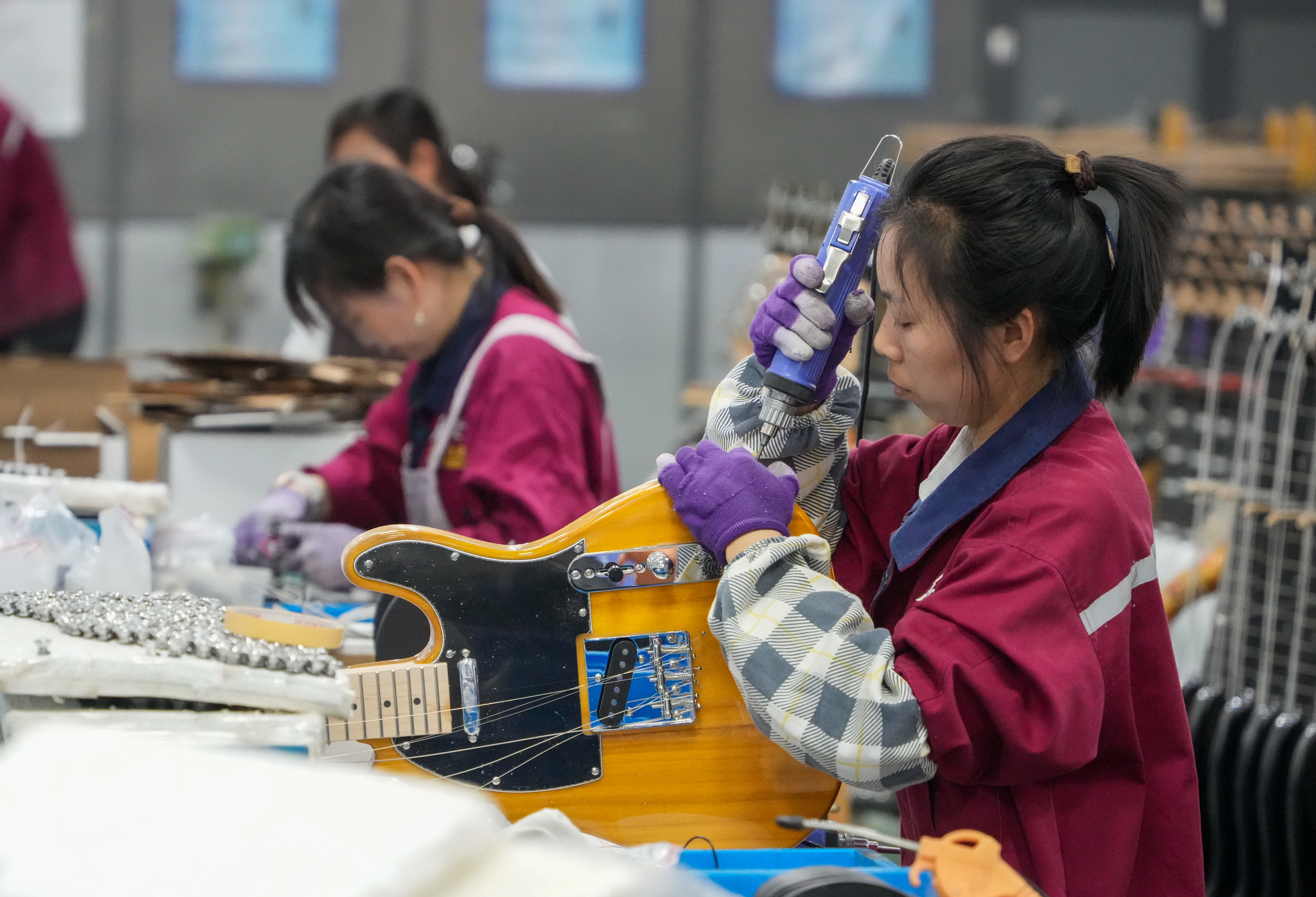 4月16日,在鄌郚镇的一家乐器坐蓐企业,责任主谈主员在装置电吉他。